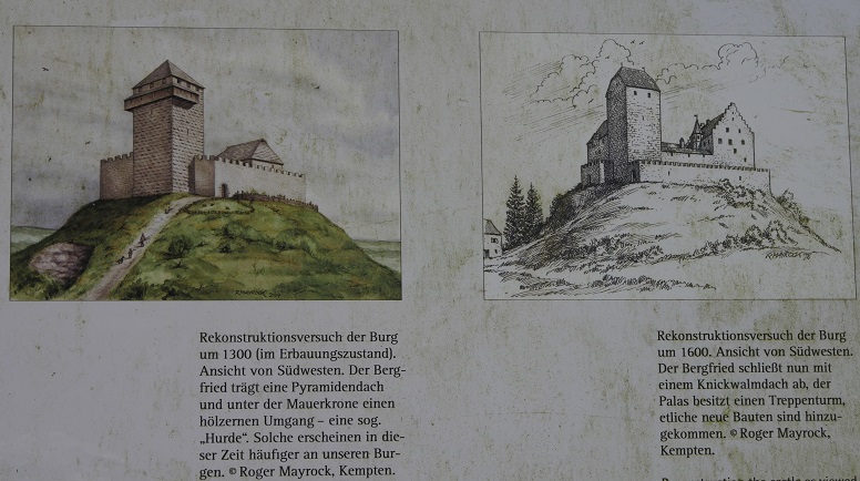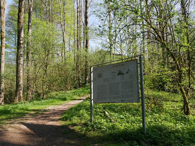 Nach etwa 20 Minuten Gehzeit weist ein Schild an einer Wegkreuzung nach links, kurz darauf geht es nochmals nach links. Und dann kommt auch schon die Infotafel am Fuß des Burghügels in Sicht.