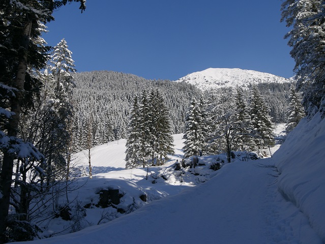 Die Schwendlestraße endet am Parkplatz vor dem Bergheim Moser. Dort beginnt der Wanderweg ins Wildental. Er führt oberhalb des Wildenbachs südwärts, der Sonne entgegen.