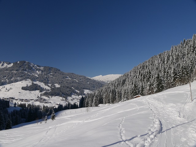 Auf dem nächsten Abschnitt sind wir einer Fahrspur zur Wiesape gefolgt, da in diesem Winter der Weg durchs Wildental nicht präpariert war. Außer uns waren nur Skitourengeher bzw. -abfahrer unterwegs.
