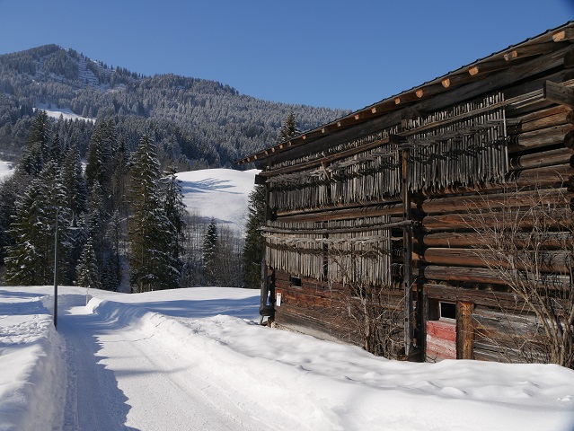Nach dem Skilift folgen wir der Beschilderung nach links zum Breitachweg. Sie schickt uns an diesem prachtvollen Stadel mit den vielen Heinzen daran hinunter zum Fluss.